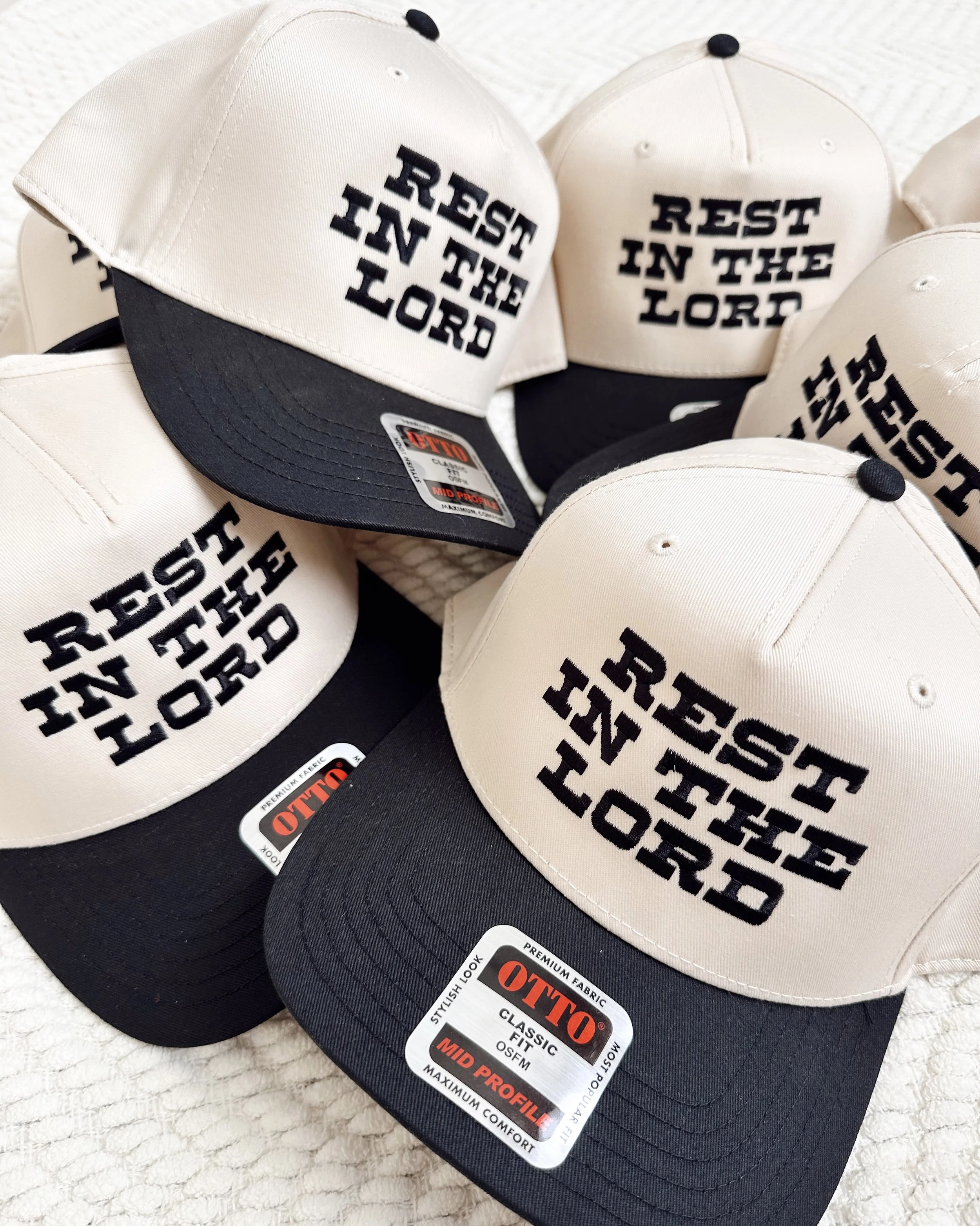 Our newest additionβtwo-tone embroidered trucker hats with βREST IN THE LORDββare finally here!